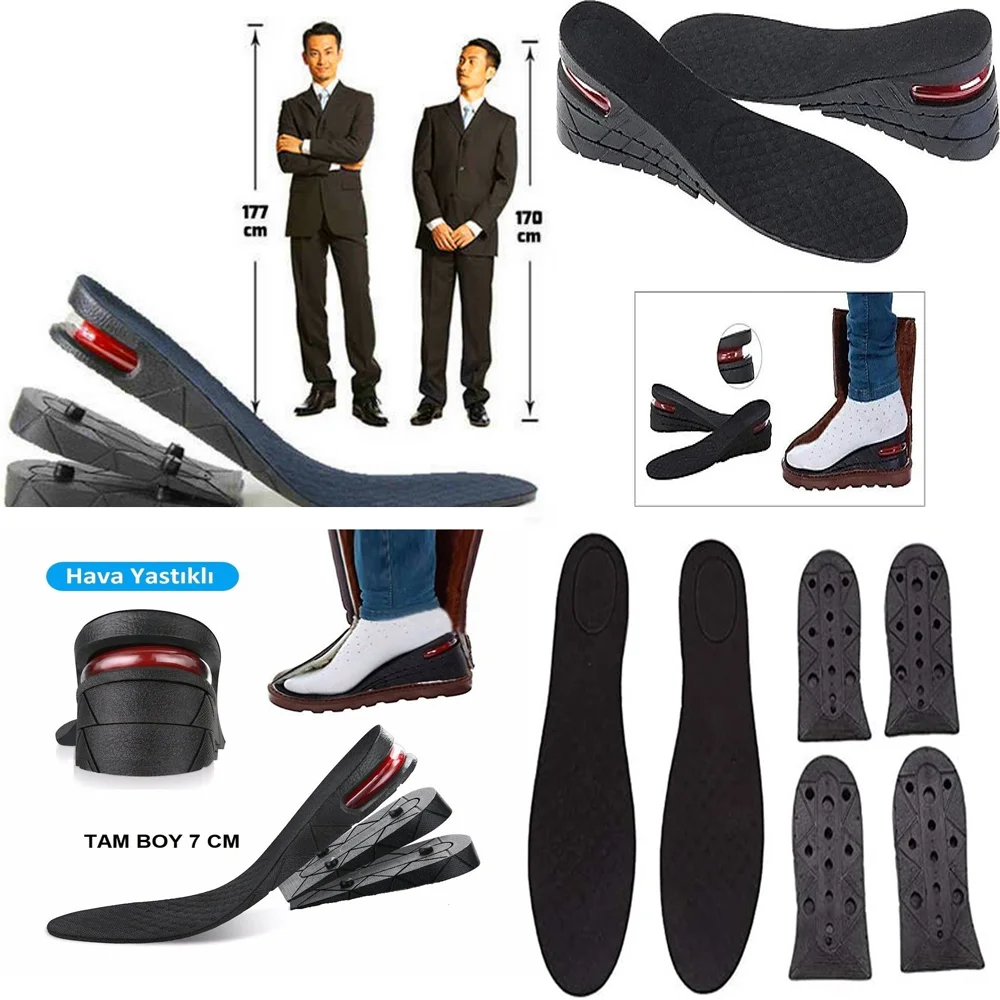 Hava Yastıklı Boy Uzatıcı Tabanlık 7 Cm Boyundan şikayetçi olan ve daha estetik bir görünüme sahip olmak isteyenler için boyunuzu uzatacak Hava Yastıklı Boy Uzatıcı 7 Cm Tabanlık.Unisex erkek ve bayan tüm ayaka numaralarına uygundur. Özel alaşımdan imal edilmiştir. Ergonomik bir tasarıma sahiptir.Boyunuz mu kısa bu durum sizi rahatsız mı ediyor. Boy Uzatıcı Tabanlık İle 7 Cm kadar boyunuzu uzatabilirsiniz.Kadın veya erkek fark etmeden herkesin kullanabileceği Hava Yastıklı Tabanlık pratik yapısı ile dikkat çekmekte.Yüksekliğini istediğiniz gibi ayarlayabilirsiniz.Pratik yapısı sayesinde kolay kullanıma sahiptir. Yapmanız gereken tek şey ayak tabanlığını ayakkabınızın tabanına yerleştirmek.Özel yapısı sayesinde yürürken ya da koşarken diz eklemlerinize binen baskıyı azaltır böylelikle yorgunluğunuzu en az dereceye indirir.Boy Uzatıcı Tabanlık Toptan Hava Yastıklı Boy Uzatıcı Tabanlık 7 Cm Özellikleri:* Kesinlikle dışarıdan fark edilmez kullanışlı son derece rahat olup aynı zamanda ergonomik bir tasarıma sahiptir.* Boy uzatıcı tabanlık tüm bay ve bayan ayakkabıları ile %100 uyumludur ve ürünün kullanımı gayet kolaydır.* Tabanlığı bir ayakkabınızdan diğer ayakkabınıza kolayca transfer edebilirsiniz( ürünü ayakkabının tabanına yapıştırmaya gerek yoktur.)* Bu yerleştirme 1.5 cm uzama sağlayacaktır üzerine eklediğiniz hava yastıklı tabanlık aparatı ile 7 cm daha yükseklik kazandıracaktır.* Dışarıdan kesinlikle farkedilmez. Hava Yastıklı Boy Uzatıcı Tabanlık 7 Cm