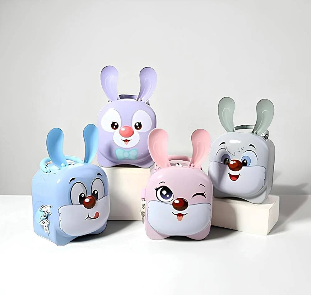 Güvenli metal kilidi olan sevimli tavşan tasarımlı kumbara. Çocuklar için ideal tasarruf alışkanlığı geliştirme ürünü.