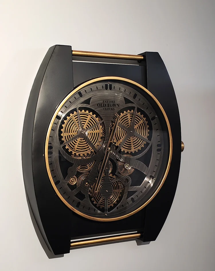 Endüstriyel tasarım akımının vazgeçilmez unsuru olan çark motifi, bu duvar saatinde ustalıkla işlenmiştir. Metal malzemeden üretilen saat, dayanıklılığı ve estetik görünümüyle uzun yıllar kullanım imkanı sunar. Çarkların döner yapısı, sadece görsel bir unsur değil, aynı zamanda saatin özgün karakterini yansıtan önemli bir detaydır.