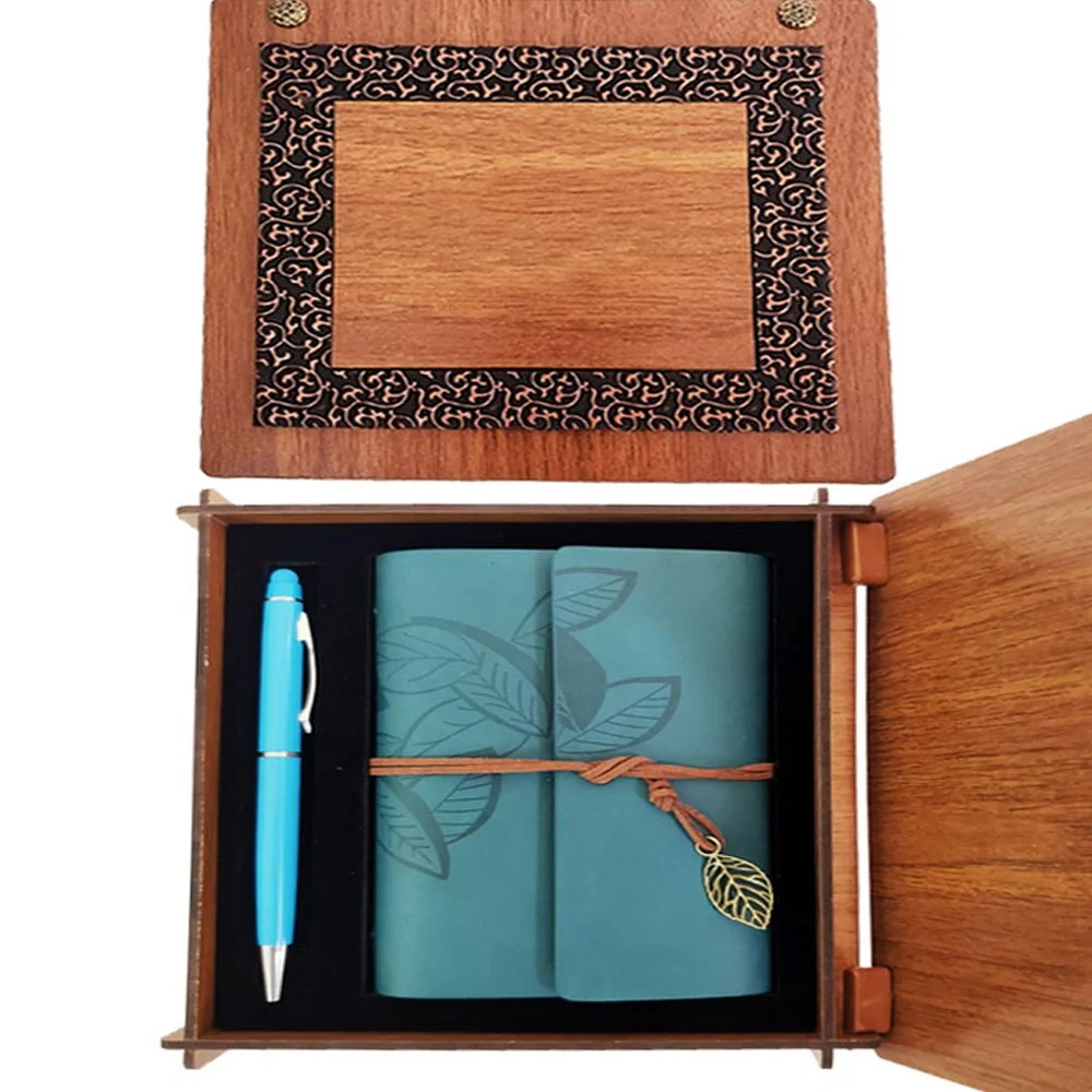 Toptan Ahşap Kutulu Mavi Deri Defter Kalem Seti