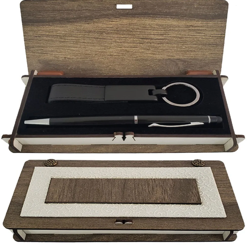 Toptan Ahşap Kutulu Siyah Kalem ve Anahtarlık Set