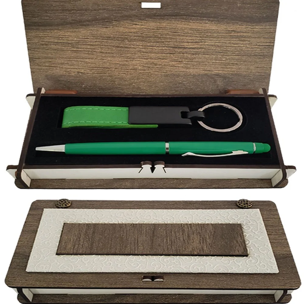 Toptan Ahşap Kutulu Yeşil Anahtarlık ve Kalem Set
